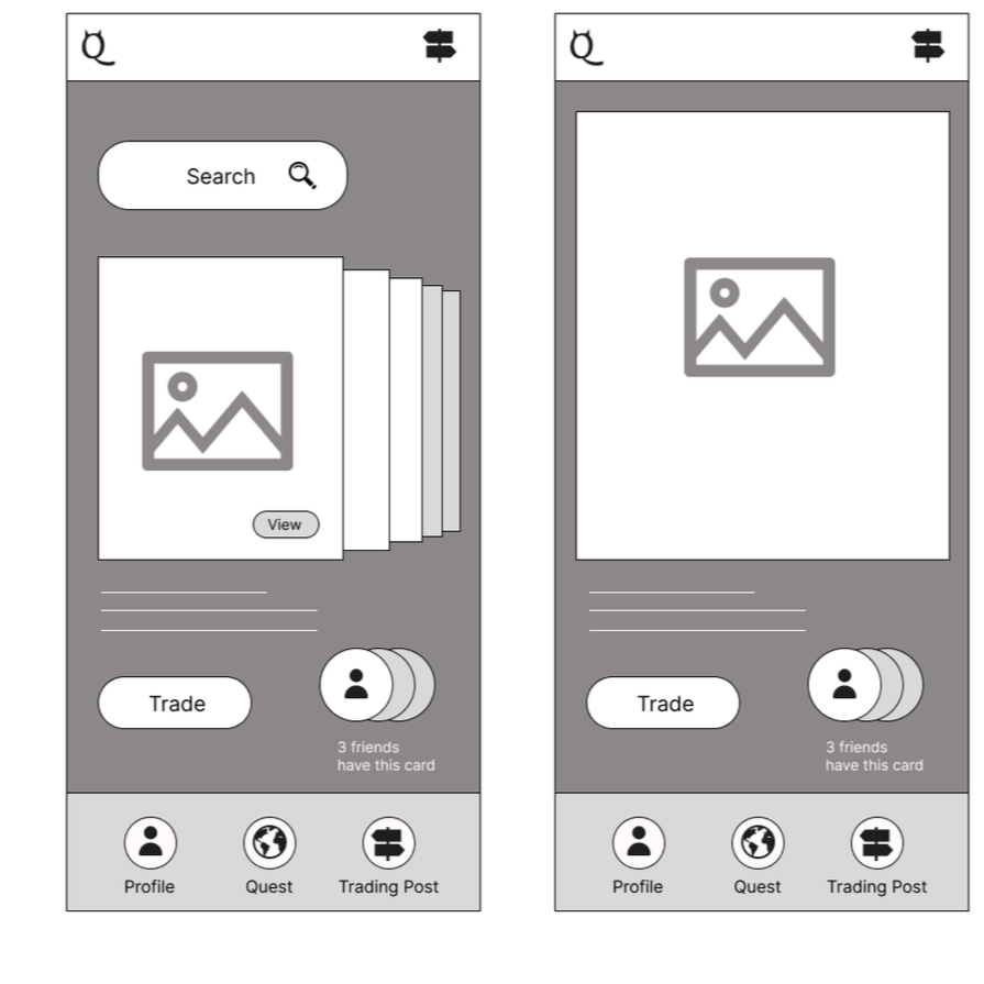 Early mid-fidelity wireframes were created in Figma to walk users through the three task flows, including “View A Creature Card” illustrated here. I eventually added two more menu items, and changed the card shuffle to a carousel, with user input guiding the design decisions I made in regards to what components to include and when to introduce them. I eventually changed the name “Trading Post” to “Inventory” (a more familiar gaming term) but kept the iconography of a multi-directional sign. I also added several different categories to the creature collection, including “Threatened” and “Invasive.” The lettermark in the upper left was also eventually swapped out to reflect the lettermark of the final logo.