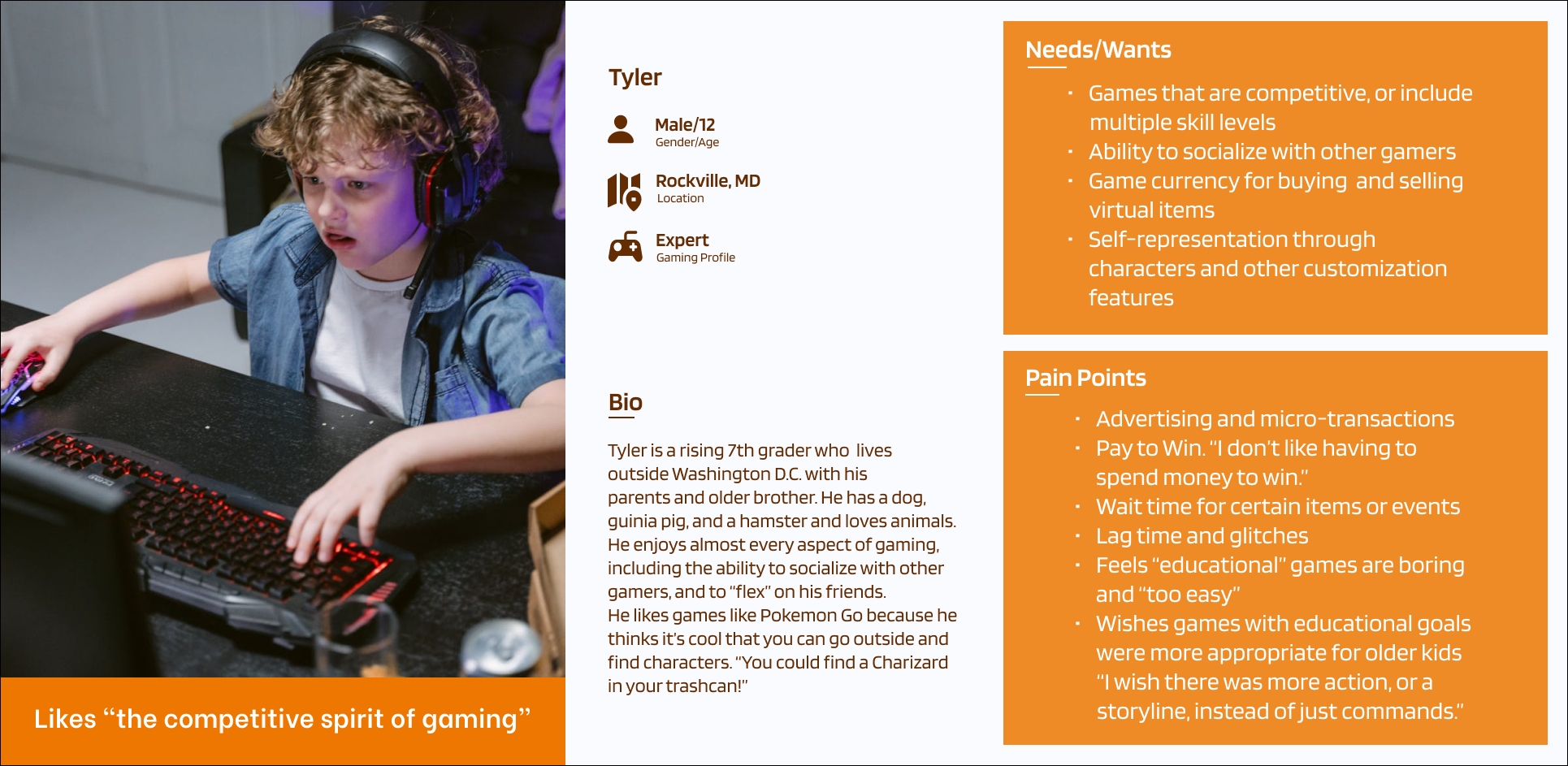 Persona: My persona is based on a 12-year-old boy who describes himself as a “gaming expert.” He says strictly educational games are “boring” and not challenging enough for older players.