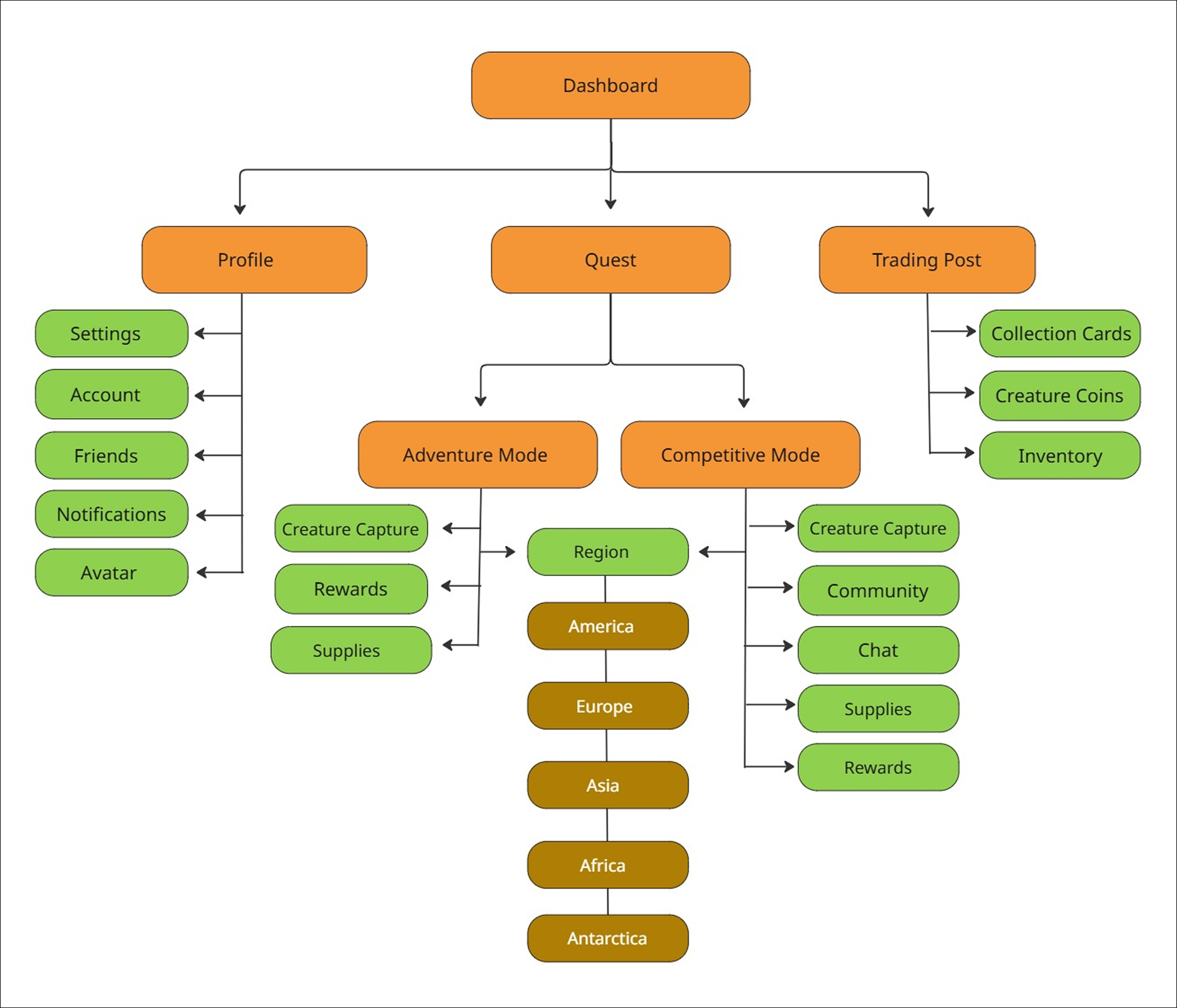 User/Task Flows: I created three possible task flows, including starting a quest, customizing your avatar, and viewing a “creature card.” These flows were chosen because they demonstrate the main objectives of my research: providing multiple levels of challenge; allowing users to customize their experience, and combining educational content with traditional game play.