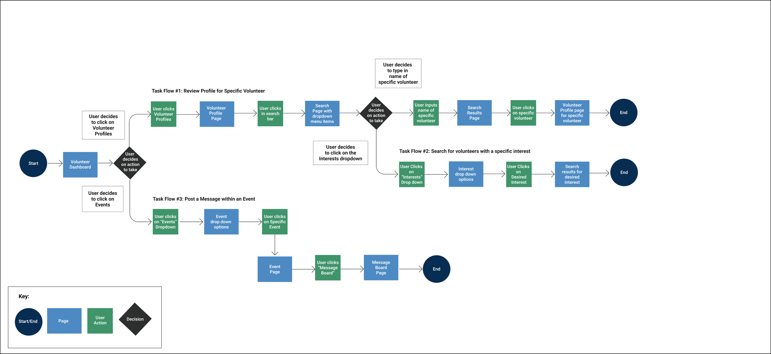 User/Task Flows: I mapped out three user flows, including reviewing the profile of a specific volunteer, seaching for a volunteer with a specific interest, and posting a message within an event. These three flows were chosen to highlight the versatility of the volunteer database, and to illustrate the ability for users to interact and communicate with eachother within the context of an event.