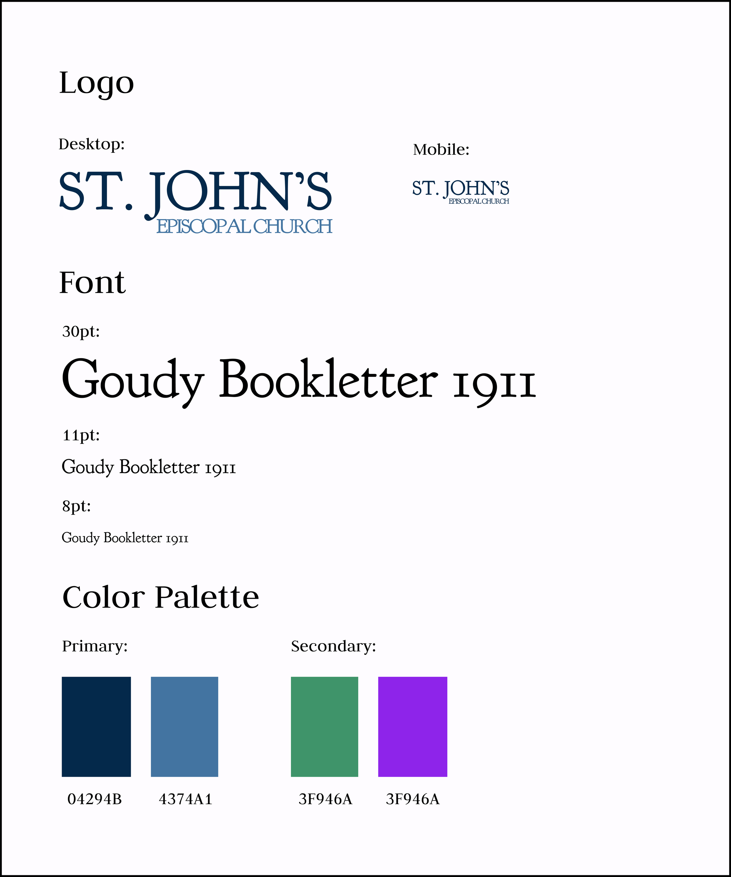 Visual Design: Since the church already had a logo and website, I borrowed from its existing color palette to design my user interface. I paired the church logo font of Felix Titling with a san sarif font (Manjari) for it’s clean look and accessibility. Users expressed a desire for a “clean, uncluttered” look and feel to the dashboard, so I kept the graphics, components and colors to a minimum in order to let the content shine.