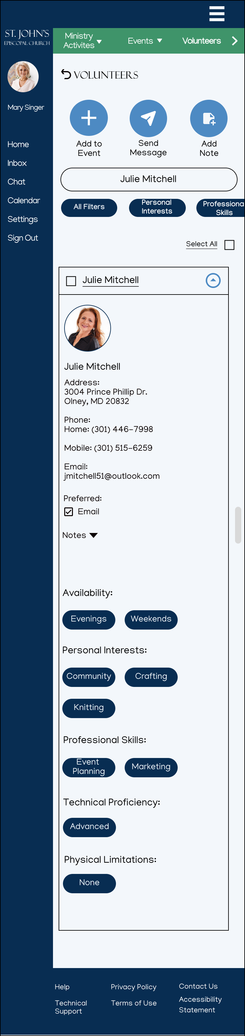 After extensive research, it became clear that my users needed a product that addressed two main goals: a centralized communication platform and a database of active volunteers who could be paired with event needs based on availability, skills, interests, and physical and technical capabilities. This last point was crucial because of the diverse range of ages in the congregation - not everyone could lift 10 lbs., or stand for long periods of time, and parishioners who worked outside the home, and/or those with young families, often faced scheduling limitations and conflicts.